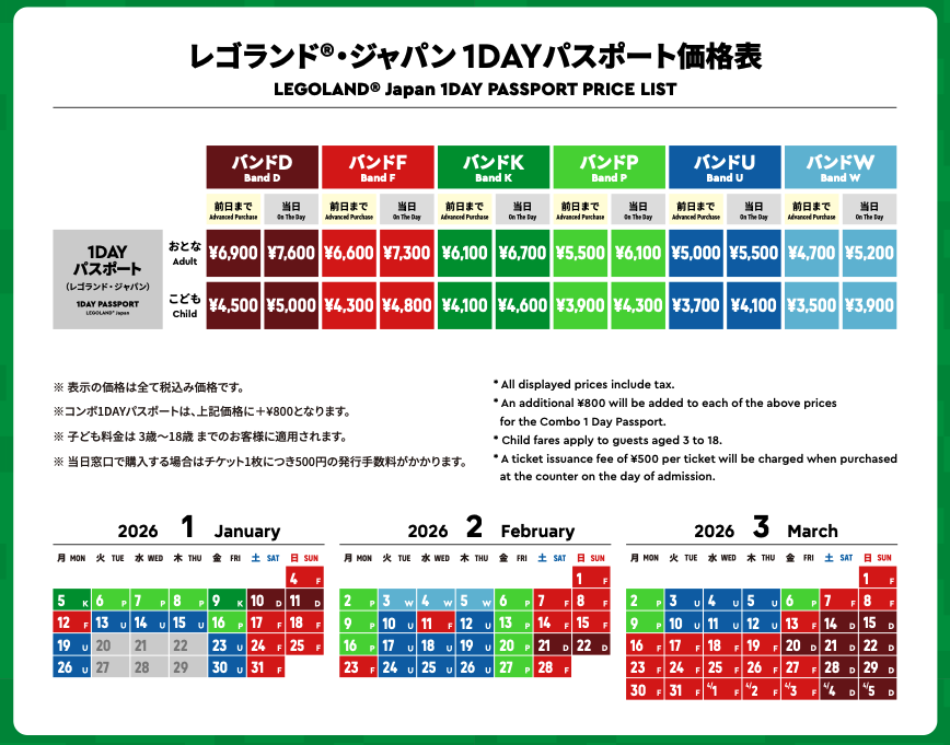 レゴランドのチケットは時期や曜日によって4段階に変動します。